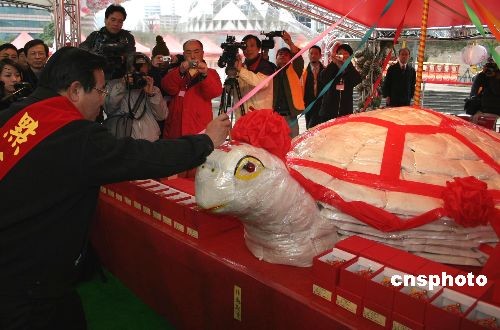 二月十五日,二00八臺北花燈節(jié)開幕,澎湖縣天后宮媽祖受邀前來。按照當(dāng)?shù)刈诮虃鹘y(tǒng),澎湖人員在花燈節(jié)現(xiàn)場造乞龜臺一座,舉行點青官為“元宵乞龜”點青儀式。(中新社/徐長安 攝)
