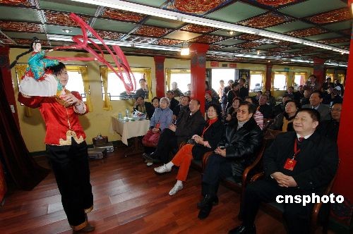 2月21日上午,在福建參加“海峽西岸鬧元宵,全球華人盼團圓”的五百多位海外華人華僑及港澳臺同胞,在乘坐游艇“海上看金門”的活動途中觀賞閩南特色的木偶戲表演。(中新社/王東明 攝)