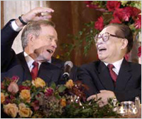 繼2002年2月美國(guó)總統(tǒng)布什訪華后,10月中國(guó)國(guó)家主席江澤民赴美訪問,兩國(guó)首腦在一年之內(nèi)兩度會(huì)晤,使得一度陰霾籠罩的中美關(guān)系云開霧散。 布什政府上臺(tái)后,中美兩個(gè)大國(guó)之間的關(guān)系幾經(jīng)跌宕。然而,面對(duì)并不安寧的世界,兩國(guó)領(lǐng)導(dǎo)人最終在交流之中求同存異,顯示出他們的務(wù)實(shí)態(tài)度與長(zhǎng)遠(yuǎn)眼光。 |