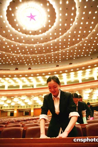 北京人民大會堂工作人員在對大禮堂進(jìn)行清潔整理,迎接即將召開的“兩會”。