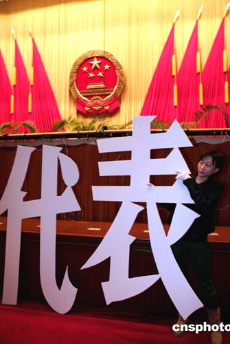 北京人民大會堂工作人員在大禮堂安裝十屆全國人大三次會議會標(biāo),為大會召開做準(zhǔn)備。