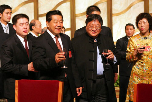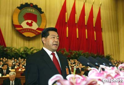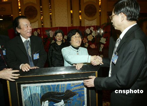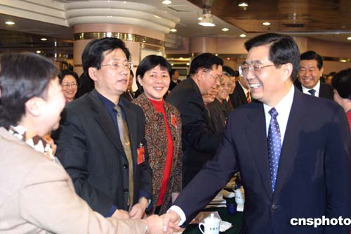 3月12日,全國政協(xié)十屆三次會議表決通過了增選董建華為全國政協(xié)副主席。國家主席胡錦濤向董建華表示祝賀。(中新網(wǎng)/廖文靜)