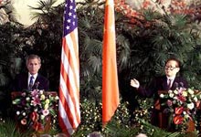 2月21日,中國(guó)國(guó)家主席江澤民與美國(guó)總統(tǒng)布什舉行會(huì)談后,在北京人民大會(huì)堂共同會(huì)見(jiàn)中外記者,并回答記者提問(wèn)。