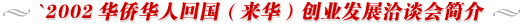 由國務院僑辦、湖北省人民政府暨武漢市人民政府共同舉辦的’2002華僑華人回國(來華)創(chuàng)業(yè)發(fā)展洽談會于5月28日——31日在武漢舉行。