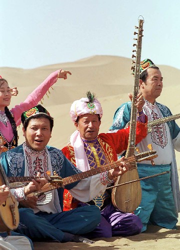 維吾爾族藝人在吐魯番庫(kù)木塔格沙漠景區(qū)為游客演奏大型套曲“十二木卡姆”