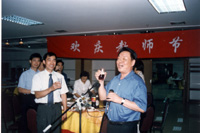 9月10日,國務院僑辦主任郭東坡、副主任李海峰、許又聲及各司局領(lǐng)導與北京華文學院全體教職員工歡渡教師節(jié)。圖為郭東坡主任(右)向大家祝賀節(jié)日。