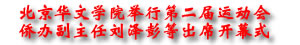 開幕式由北京華文學(xué)院副院長王杰主持,院長彭俊致開幕詞,蒙古學(xué)生劉海霞代表運(yùn)動(dòng)員講話。劉澤彭副主任在祝辭中首先轉(zhuǎn)達(dá)了國務(wù)院僑辦主任陳玉杰對(duì)全院師生的親切問候,同時(shí)指出,在中國人民抗擊“非典”取得了階段性勝利的時(shí)刻,北京華文學(xué)院舉行這場(chǎng)運(yùn)動(dòng)會(huì),對(duì)增強(qiáng)學(xué)生體質(zhì),增加大家戰(zhàn)勝“非典”的信心等方面都有重要的積極意義。劉澤彭副主任最后鼓勵(lì)學(xué)生在學(xué)好漢語的同時(shí),強(qiáng)身健體,抵御疾病,并祝運(yùn)動(dòng)會(huì)圓滿成功。