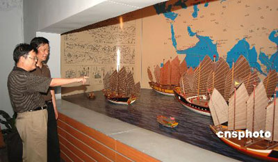 “海上絲綢之路”起點(diǎn)福建泉州海外交通史博物館裝扮一新,喜迎來參加“鄭和下西洋與華人華僑”系列活動(dòng)的海外人士的到來。圖為該博物館展示的鄭和下西洋船隊(duì)揚(yáng)帆起航的模型。 |
