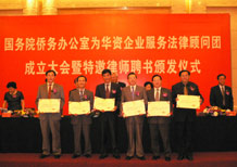 為貫徹落實全國僑務(wù)工作會議精神,加大“依法護僑”工作力度,不斷提高為華資企業(yè)服務(wù)水平和成效,推動海外華商在我國經(jīng)濟建設(shè)中發(fā)揮更大的作用,根據(jù)國務(wù)院僑辦2005年工作要點,借助社會專業(yè)力量,國務(wù)院僑務(wù)辦公室籌備成立了“為華資企業(yè)服務(wù)法律顧問團”(以下簡稱“法律顧問團”),并于6月17日在京舉行了“法律顧問團”成立大會暨特邀律師聘書頒發(fā)儀式。
