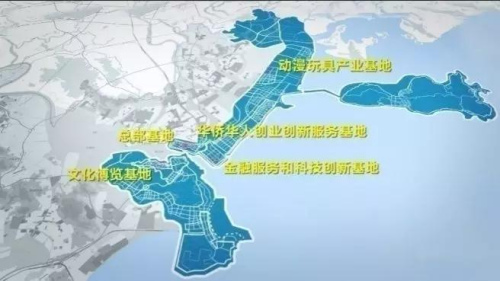 五基地:華僑華人創(chuàng)業(yè)創(chuàng)新服務(wù)基地、總部基地、金融服務(wù)和科技創(chuàng)新基地、動漫玩具產(chǎn)業(yè)基地、文化博覽基地