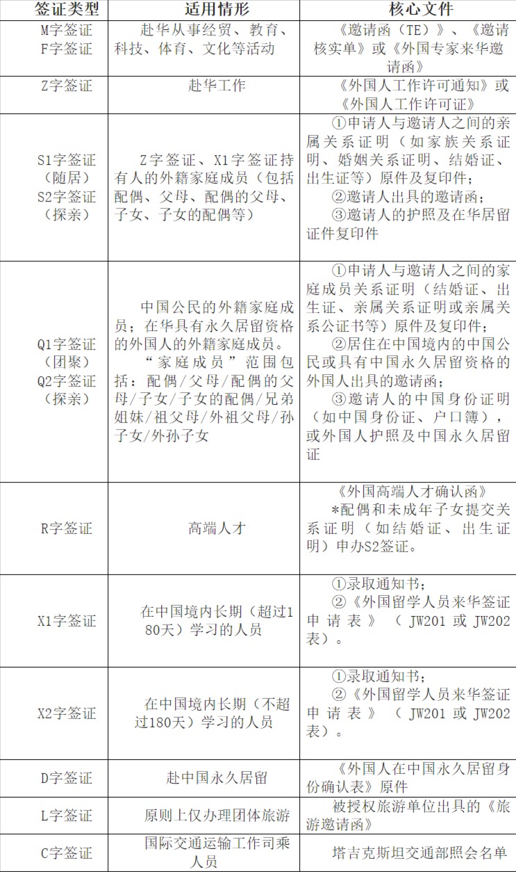 二、當(dāng)前可受理簽證類型和核心文件