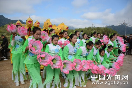 在鑼、鼓、釵、鈸等打擊樂器的伴奏下,方山鄉(xiāng)校的二十余名學(xué)生分別身著富有民俗特色的表演服飾依次登場。表演時,男孩子手持魚燈時而激越歡暢,時而輕歌曼舞,時而纏綿抒情,時而剛烈奔放;女孩子手持蓮花燈,如行云流水般不斷變化舞蹈隊列和陣形;通過“魚”在“蓮花”中不斷穿梭,描述魚兒戲蓮、自由歡暢、激流勇進、昂揚向上的生活情景,引得群眾競相圍觀,紛紛拍手稱好。