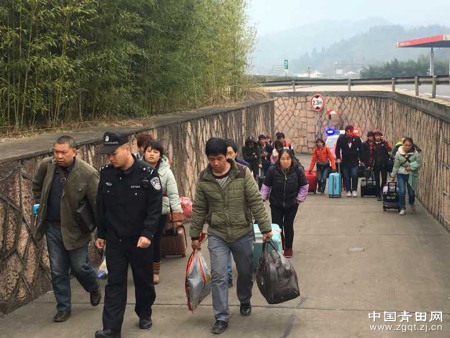 隨后,派出所民警和服務(wù)區(qū)工作人員通過服務(wù)區(qū)的安全通道,將帶他們到青田服務(wù)區(qū)麗水方向,并幫他們尋找到麗水的便車,但因人員太多一直不太方便。半小時(shí)后,終于攔下一輛從溫州開往常山的快客,經(jīng)過溝通,車主同意帶他們到麗水富嶺出口。在上車之際,這些來自貴州的務(wù)工人員對派出所民警和服務(wù)區(qū)工作人員的熱情幫助感激不已。