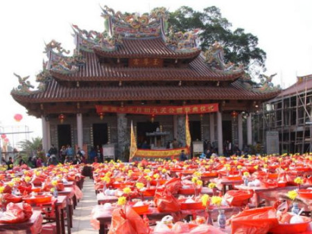 “敬天公”從大年初九凌晨開始。此時,家家戶戶都要開始放鞭炮,廳堂上點燃紅燭燈,稱為“老天爺燈”;然后,長輩們領(lǐng)著一家大小跪在桌前,并依長幼順序上香,行三跪九叩禮,祈求在新的一年里福運高照,家人平安,事業(yè)昌隆,儀式一般會進行到初九清晨五點左右。