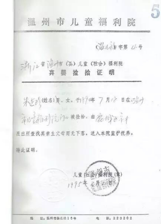 琳西說,她是1994年7月18日晚被遺棄在(溫州)市兒童福利院門口的,當(dāng)時用一條毯子包裹著。被好心人發(fā)現(xiàn)時,她身上還有一張舊日歷、紅色紙條,以及一張10元紙幣。紙條上寫著她的出生日期“1994年6月14日”外,還寫著一個“黃”字。