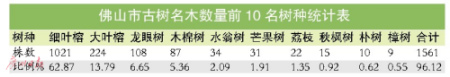 據(jù)調(diào)查統(tǒng)計(jì),佛山市的1624株古樹分屬47種,主要樹種為細(xì)葉榕、大葉榕、龍眼樹、木棉樹、芒果樹、荔枝、秋楓樹、樸樹、樟樹等,占古樹名木總數(shù)的96.12%。記者發(fā)現(xiàn),在古樹名木數(shù)量前10名樹種中,主要以榕樹為主,其中細(xì)葉榕的比例高達(dá)62.87%。