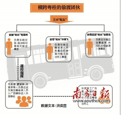 經(jīng)初步審查查明,該犯罪團(tuán)伙主要以在粵“蛇頭”許某飛、在桂“蛇頭”韋某輝、東南亞籍“蛇頭”農(nóng)某雪等人為首,通過招募和唆使的方式,組織東南亞籍人員偷渡入境后非法務(wù)工。