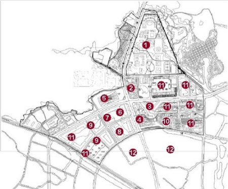 “四片區(qū)”即沿城鎮(zhèn)中軸,依據(jù)功能不同,劃分為教學(xué)區(qū)、城鎮(zhèn)區(qū)、運動公園區(qū)和生態(tài)濕地區(qū)四大片區(qū),并分散式布置多功能節(jié)點,形成以學(xué)帶研、以研帶游、以游興城、以城促學(xué)的全新系統(tǒng)形態(tài)和創(chuàng)新模式。