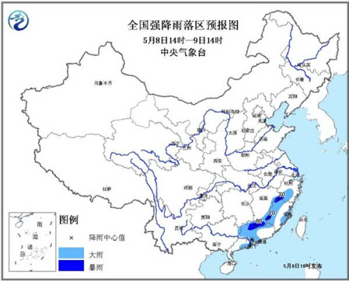 預(yù)計,5月8日14時至9日14時,浙江南部、福建、江西東部和南部、湖南南部、廣東北部和南部沿海、廣西東北部等地的部分地區(qū)有大雨,其中,浙江西南部、福建西部、江西東部和南部、廣東北部等地局部有暴雨(50~80毫米),上述部分地區(qū)并伴有短時強(qiáng)降水、雷暴大風(fēng)或冰雹,小時雨強(qiáng)20~50毫米,最大可達(dá)60毫米以上。