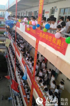 海南華僑中學(xué)學(xué)生“喊樓”為高三考生加油(組圖)