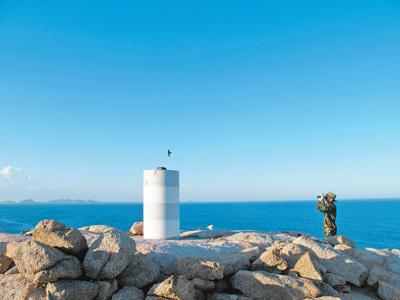 科考隊員在大洲島觀察被金絲燕鳴聲招引過來的金絲燕。