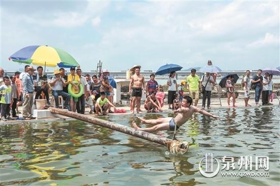 南薰樓前的大游泳池內(nèi),橫放著一根長(zhǎng)達(dá)六七米的圓木,圓木上面涂滿潤(rùn)滑油。參賽選手必須赤腳通過木柱,才有資格去捉泳池中的鴨子,而最終成功抓到鴨子的選手就可以將鴨子帶走。但是,想在水里合力捕捉一只熟悉水性的鴨子也沒那么簡(jiǎn)單,即使幾名大漢合力包抄,仍老是被看似呆萌的鴨子“戲弄”,怎么也抓不住。不過,鴨子和選手玩“躲貓貓”的過程倒是十分有趣,被“戲弄”的選手們也樂在其中。