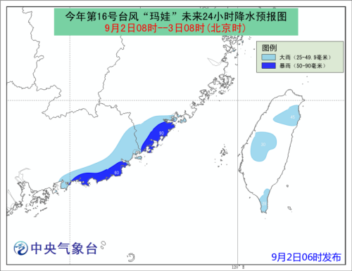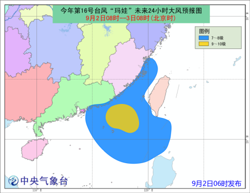 大風預報:2日08時到3日08時,臺灣海峽、巴士海峽、南海東北部以及福建沿海、廣東東部沿海將有7-8級大風,“瑪娃”中心經(jīng)過的附近海域的風力有9-10級,陣風可達11-12級。