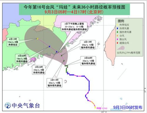 預(yù)計,“瑪娃”將以每小時5-10公里的速度向西北方向移動,將于今天下午到晚上在廣東汕尾到汕頭一帶沿海登陸(熱帶風(fēng)暴級或強熱帶風(fēng)暴級,20-25米/秒,8-10級),登陸后強度迅速減弱。