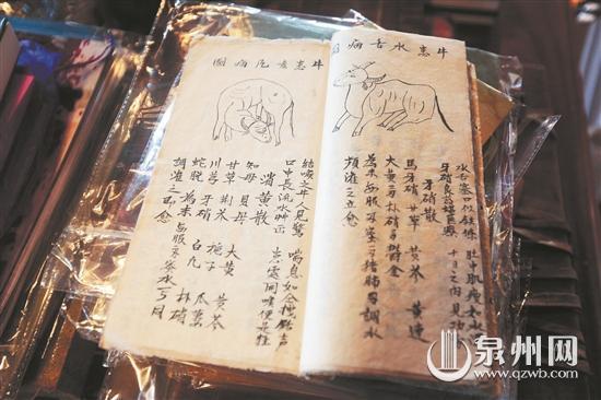 這些藏書中也不乏一些“趣書”。朱先生拿出一本新中國成立前的手抄本書籍,名為《針牛穴道》,是介紹給牛治病的,翻開一看,甚是有趣。開篇是“考證針牛穴道圖形”,畫工精美,栩栩如生,精壯的牛兒身上標(biāo)記了35個(gè)穴道;往下,分門別類記載了“牛患水草不通、?;枷x子進(jìn)耳、顫冷咳嗽、打肋腸結(jié)”等數(shù)十種牛兒病癥;每種病癥中,對應(yīng)一幅病牛體征圖畫,形象生動(dòng),接著介紹如何用中藥或生活食材治病。那時(shí)的耕牛既是重要的勞動(dòng)力,也是一戶農(nóng)民家庭的最大財(cái)富,給病牛治病自然是大事,《針牛穴道》就記載了運(yùn)用中醫(yī)給牛治病的知識。“看這本書,可見中醫(yī)博大精深,人民也有大智慧?!?/p>