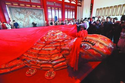 亮相鎮(zhèn)海樓的這只“米龜”,由澎湖老師傅花了三天三夜制作完成。師傅先要在地上用木頭搭建一個龜體骨架,隨后按照龜首、龜背、龜腳等順序,排列堆疊千余包大米。