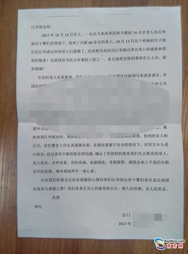 南方網(wǎng)訊(全媒體記者/楊興樂 通訊員/趙國(guó)富)2017年10月13日早上,一名70多歲的老人到江門市公安局江華派出所求助,稱其是馬拉西亞歸國(guó)華僑,請(qǐng)求民警幫忙尋找其失散多年的親人。