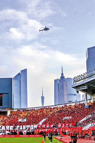 時間回溯到11月4日下午。當天廣州恒大淘寶隊在天河體育中心進行本年度中超聯(lián)賽最后一輪比賽。比賽期間,一架直升機持續(xù)在天河體育中心上空低飛盤旋?,F(xiàn)場不少球迷也“識趣”地朝直升機攝像頭揮手致意。有視力好的觀眾發(fā)現(xiàn),直升機上噴有中央電視臺《航拍中國》攝制組的相關字樣。