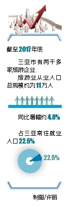 三亞旅游發(fā)展?jié)摿θ绾危繑?shù)據(jù)透露出樂觀答案。根據(jù)《白皮書》統(tǒng)計,截至2017年底,三亞市有兩千多家旅游企業(yè),旅游業(yè)從業(yè)人口總規(guī)模約為11萬人,同比增幅約4.8%,占三亞常住就業(yè)人口22.5%,超過1/5。其中,涉旅行業(yè)中,從事旅游酒店、旅游景區(qū)、度假公寓行業(yè)人才數(shù)量尤為突出,三大行業(yè)旅游人才數(shù)量逾7萬人,成為該市旅游人才結(jié)構(gòu)的重要組成部分。