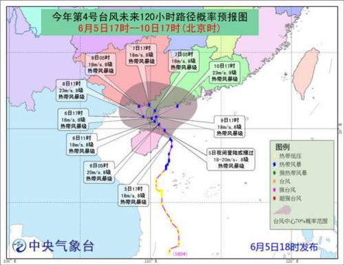 從移動路徑上看,第四號臺風將成為今年首個登陸我國的臺風。中央氣象臺預計,它將于將于今天夜間登陸或擦過海南文昌沿海,6日早晨到中午登陸廣東徐聞到吳川一帶沿海今天夜間登陸或擦過海南島。較常年首個登陸臺風提前20天左右。