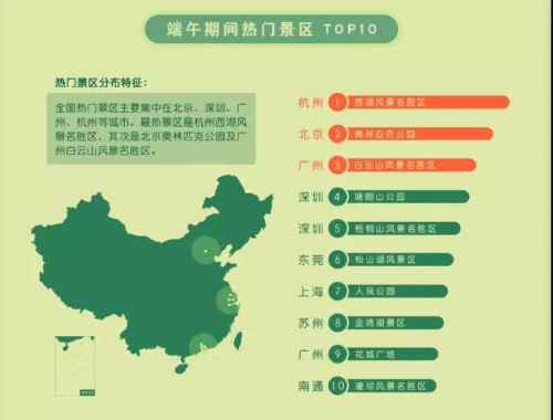 端午出游如何避開熱門景區(qū)?中國旅游協(xié)會(huì)與高德地圖聯(lián)合發(fā)布的端午出游指南顯示,端午期間全國熱門景區(qū)主要集中在北京、深圳、廣州、杭州等直轄市及省會(huì)城市。最熱景區(qū)是依舊是杭州西湖風(fēng)景名勝區(qū),其次是北京奧林匹克公園和廣州白云山風(fēng)景名勝區(qū)。