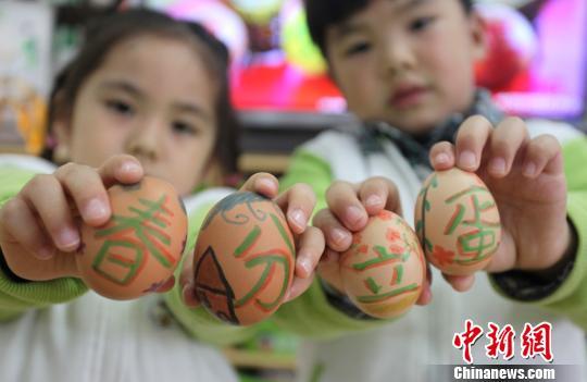 圖為小朋友展示寫著“春分立蛋”的手繪彩蛋。孟德龍 攝