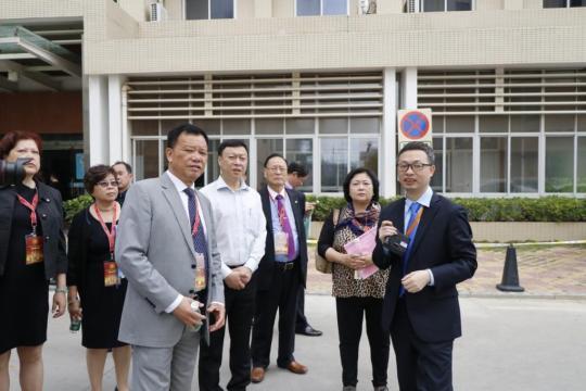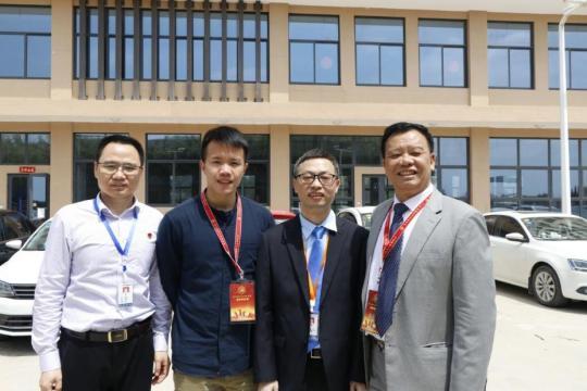 晉南分院院領(lǐng)導(dǎo)與旅港鄉(xiāng)賢施能獅(右一)及其家人在晉南分院后勤保障樓前合影