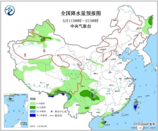 圖3 全國降水量預(yù)報圖(4月30日08時-5月1日08時)