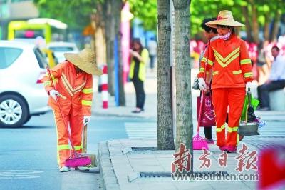 禪城區(qū)環(huán)衛(wèi)工人在路邊打掃衛(wèi)生。南方日報記者 戴嘉信 攝