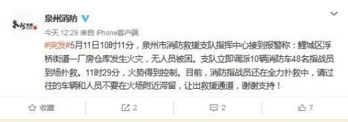 福建泉州一廠房倉(cāng)庫(kù)發(fā)生火災(zāi):仍在撲救 無(wú)人員被困