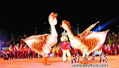澄?!半p咬鵝舞”用舞蹈的形式表現(xiàn)素有“鵝王”之稱的澄海獅頭鵝的神態(tài)和習性。張偉煒 翻拍