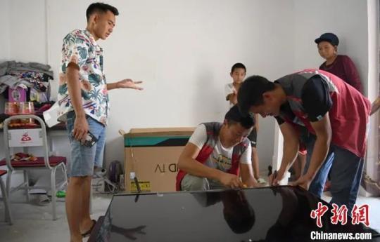 快遞小哥為村民且沙次爾家安裝調(diào)試電視機(jī),村民且沙次爾一家很開(kāi)心?!⒅铱?攝