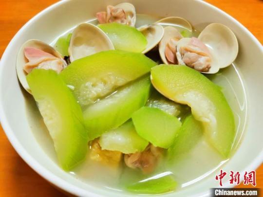 “以前老一輩人講,清明前吃嫩節(jié)瓜,夏至后吃老節(jié)瓜。如今的春節(jié),大家對(duì)雞、鵝、燒豬肉等吃多了會(huì)覺(jué)得膩,烹頓蝦米仔炒節(jié)瓜或腐乳炒節(jié)瓜都很‘利口’(臺(tái)山話為爽口的意思)。天氣炎熱時(shí),本地人喜歡用節(jié)瓜煲湯或滾湯,如蝦干(或蝦米)節(jié)瓜湯、咸蛋瘦肉節(jié)瓜湯、沖菜葉節(jié)瓜湯、泥猛魚(yú)節(jié)瓜湯、石斑仔節(jié)瓜湯、白貝(或沙白)節(jié)瓜湯等,湯水鮮甜,烹飪做法較為簡(jiǎn)單,據(jù)聞?dòng)薪馐睢⒅箍?、生津等作用。”臺(tái)城街道園田社區(qū)年過(guò)七旬的黃大爺說(shuō),嫩節(jié)瓜僅需用小刀或竹片把皮刮掉就可切塊烹飪,老節(jié)瓜烹飪前則需削皮、刨去瓜瓤。