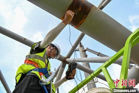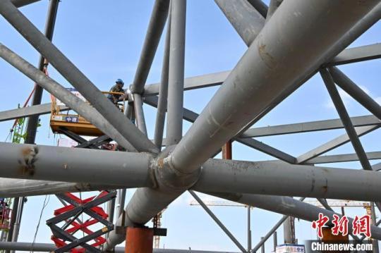 8月30日,中鐵建設(shè)集團有限公司工作人員測量汕頭站新站房鋼結(jié)構(gòu)屋架放線。記者 陳驥旻 攝