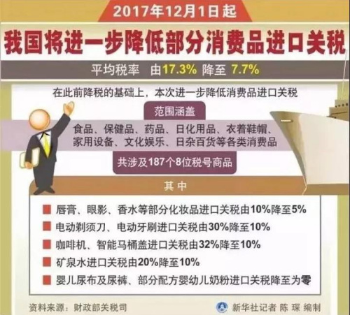 財(cái)政部近日發(fā)布消息,從12月1日起,我國將進(jìn)一步降低部分消費(fèi)品進(jìn)口關(guān)稅,平均稅率由17.3%降至7.7%。