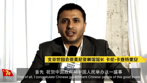 北京世園會(huì)亞美尼亞展館館長(zhǎng)卡倫 卡查特里安表示,中國(guó)開(kāi)始在世界上扮演重要的角色,很多國(guó)家希望與中國(guó)建立良好的文化和經(jīng)濟(jì)方面的聯(lián)系。祝福新中國(guó)70周年生日快樂(lè)!