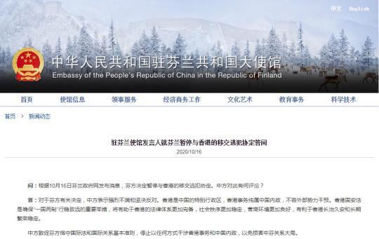 駐芬蘭使館回應“芬蘭暫停與香港的移交逃犯協定”