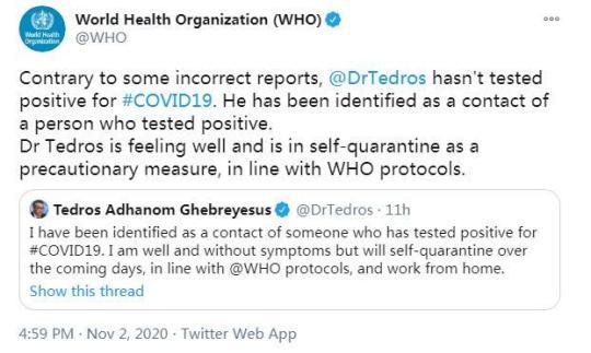 當?shù)貢r間11月2日,世衛(wèi)組織在官方社交媒體賬號上發(fā)文稱:“與一些錯誤的報道相反,譚德塞并沒有新冠檢測呈陽性。他已經(jīng)被確認與一名新冠檢測呈陽性的人有過接觸。譚德塞目前感覺良好,并按照世衛(wèi)組織的規(guī)定,作為預防措施,正在進行自我隔離?!?/p>