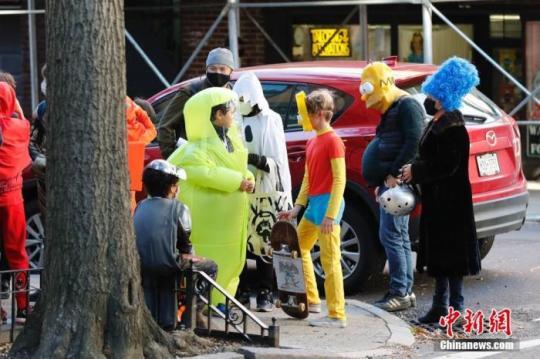 當?shù)貢r間10月31日,美國傳統(tǒng)節(jié)日萬圣節(jié)前夜,紐約市布魯克林區(qū)穿著萬圣節(jié)裝束的孩童到各處要糖,其中一名孩童穿著卡通隔離服。中新社記者 廖攀 攝