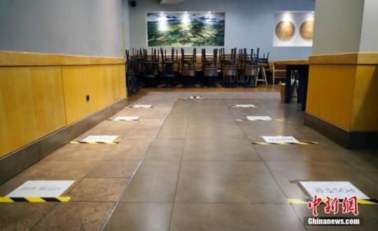 9月1日,韓國首爾市鐘路區(qū)一家連鎖咖啡廳內,桌椅全被搬空,地上貼有提示,要求等待取餐人員間隔1米以上。 中新社記者 曾鼐 攝